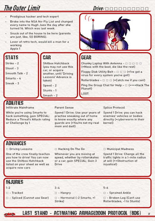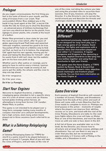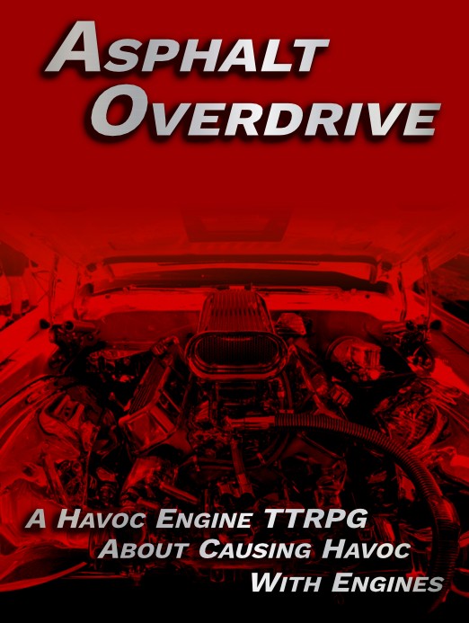 A TTRPG designed for groups of 3-7 people to be played over a short campaign of 3 sessions, Asphalt Overdrive is based on the Havoc Engine used to power the Eat the Reich RPG by Rowan, Rook and Decard Games.